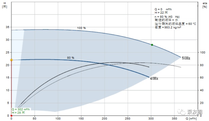 为了更好的解释,我们来举个例子阐述,某暖通系统,设计给定每台泵参数(流量:302m/h,扬程:28m),管损22m,假设实际使用参数也为此参数。根据此参数,泵选型为如下图泵,此泵经过变频计算,40Hz闭阀扬程为22m,此泵最低运行频率为40Hz。